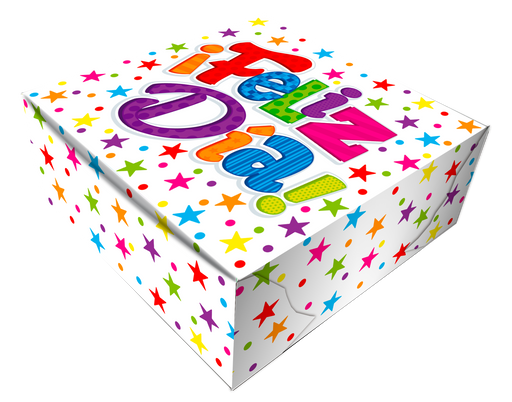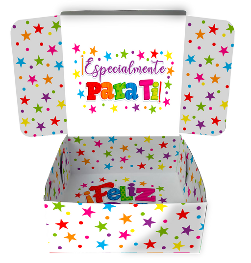 Caja Fantasia Mediana Feliz Dia Estrellas Multicolor x 1 Unidad REF: FM-05 Fabricada encartulina calibre 18 Dimensiones: 9,8 cm de alto x 28,2 cm ...