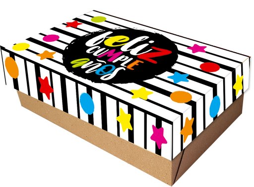 Fiesta 1963Caja Obsequio Grande Feliz Cumpleaños Rayas x 1 Unidad REF: COG-39 Fabricada en cartulina calibre 18 y base en material Microcorrugado Dimensiones:...