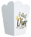Fiesta 1963Caja Piramide Mediana Blanca Feliz Dia Mostacho x 1 Unidad REF: CP-101 Fabricada encartulina calibre 18 Dimensiones: 14,5 cm de alto x 8,2 cm de l...