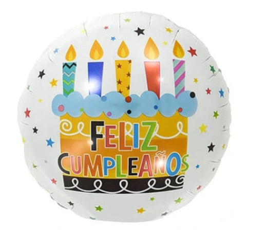 Precio original $2.800,00Precio actual $1.800,00| /Globo Metalizado Redondo Feliz Cumpleaños Torta y Estrellas Blanco 18"