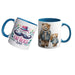 Taza en Ceramica Blanca (Interior y Manija en color Azul) Sublimada con diseño a eleccion. Apto para contacto con alimentos, Dimensiones: 8 cm de Diametro x 9.5 cm de alto/ Capacidad 11 Onzas