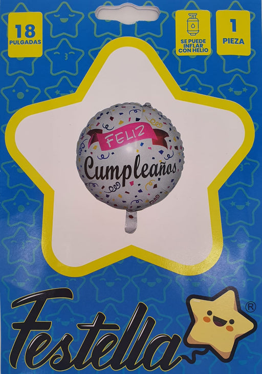 FestellaGlobo Metalizado Redondo Feliz Cumpleaños Blanco Confetti 18" Festella