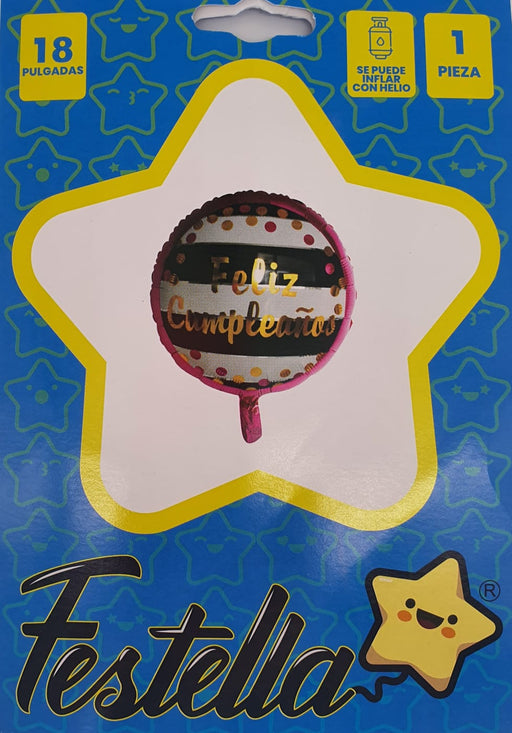 FestellaGlobo Metalizado Redondo Feliz Cumpleaños Rayas Blanco Negro 18" Festella