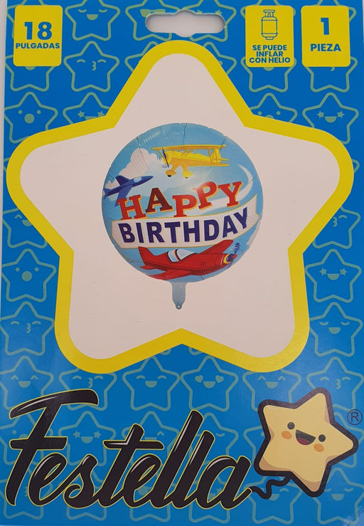 Globo Metalizado Redondo Happy Birthday Aviones 18" Festella